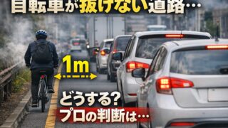 2026年4月の自転車1mルール施行で「追い抜けない渋滞」が多発。なぜ現場で異様な光景が起きているのか?無理に抜くべきか、待つべきか。現役タクシードライバー歴8年のヤヌスが、プロの判断基準と安全な対処法をわかりやすく解説します。